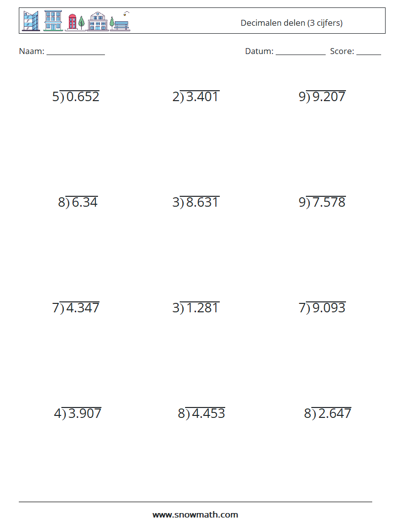 (12) Decimalen delen (3 cijfers) Wiskundige werkbladen 3