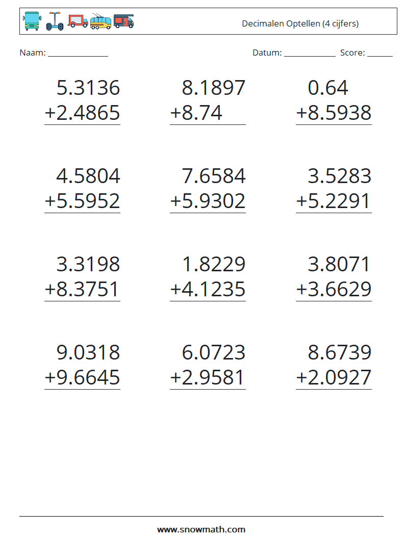 (12) Decimalen Optellen (4 cijfers) Wiskundige werkbladen 3