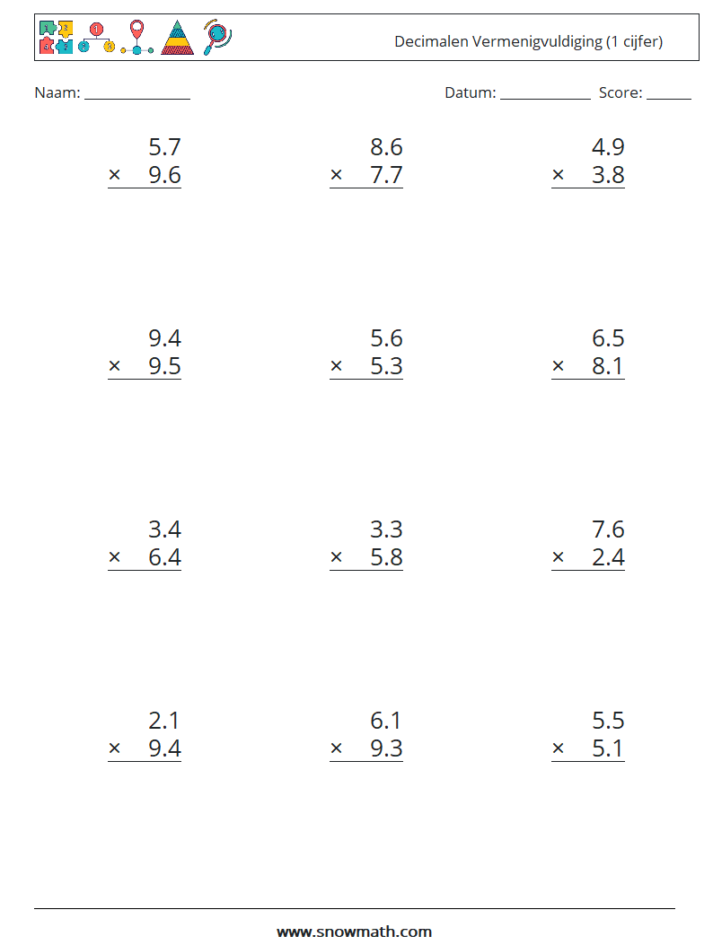 (12) Decimalen Vermenigvuldiging (1 cijfer) Wiskundige werkbladen 3