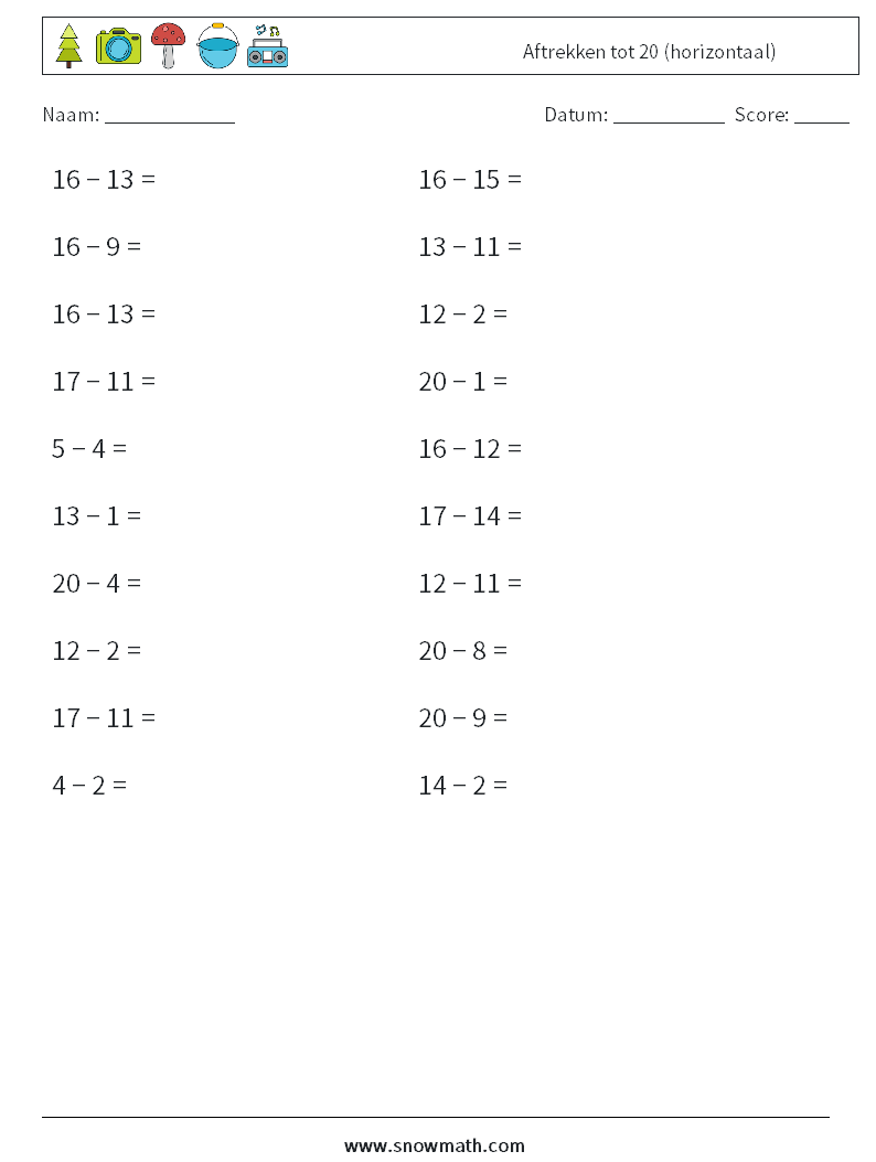 (20) Aftrekken tot 20 (horizontaal) Wiskundige werkbladen 2