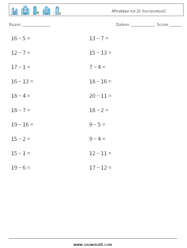 (20) Aftrekken tot 20 (horizontaal) Wiskundige werkbladen 7