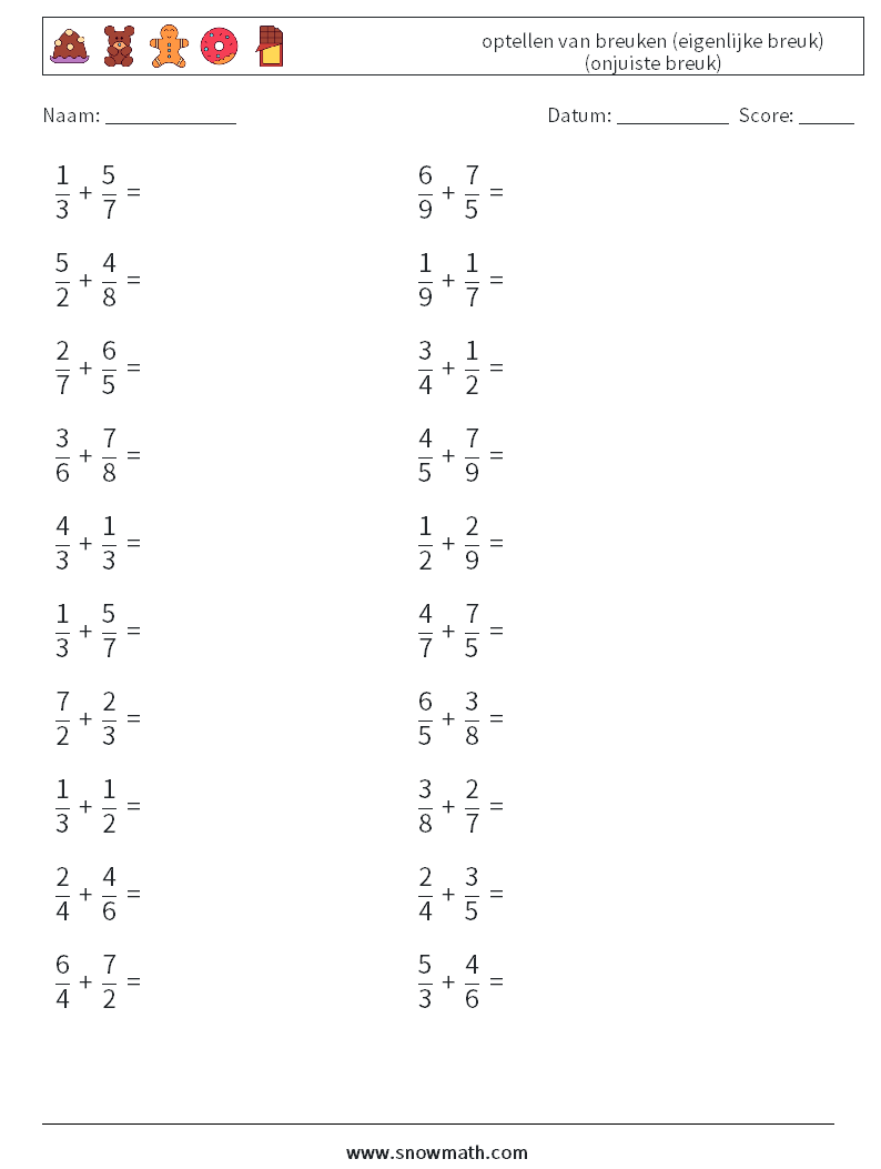 (20) optellen van breuken (eigenlijke breuk) (onjuiste breuk) Wiskundige werkbladen 10