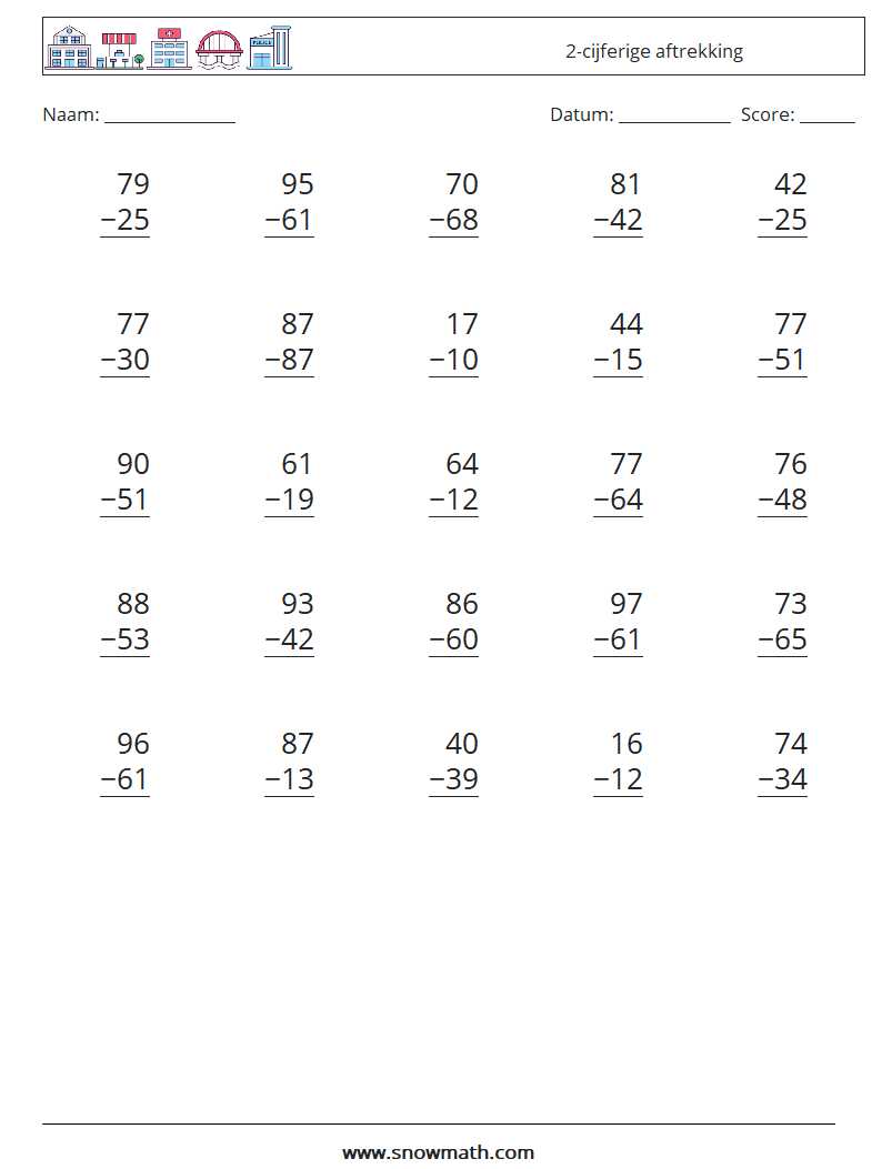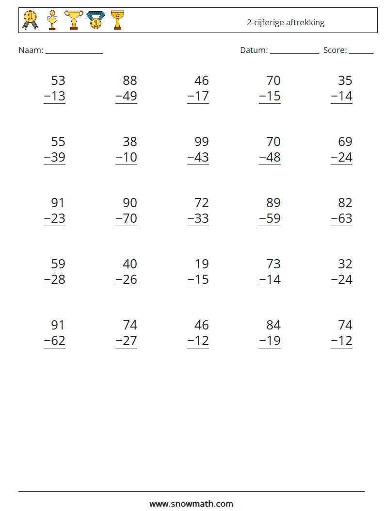 (25 wiskundevragen) 2-cijferige werkbladen voor aftrekken.