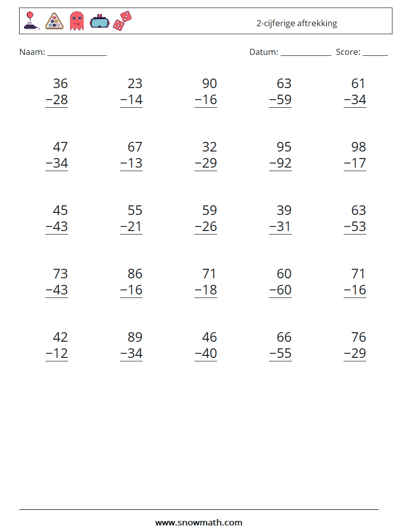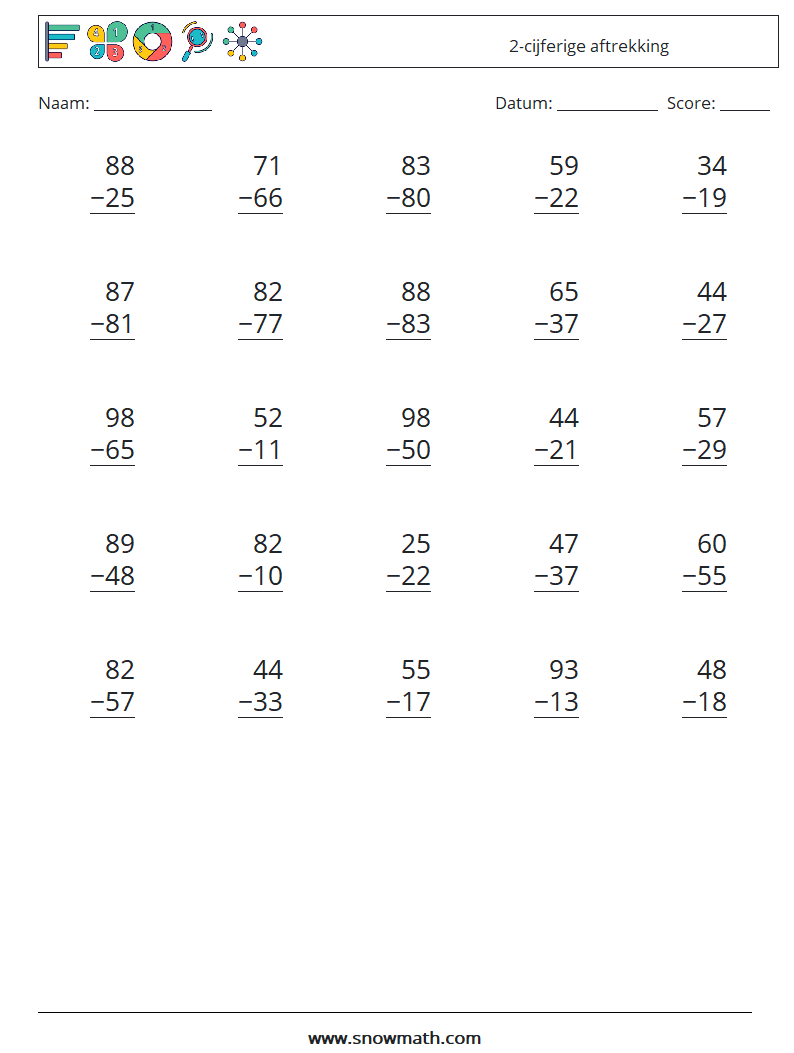 (25 wiskundevragen) 2-cijferige werkbladen voor aftrekken.