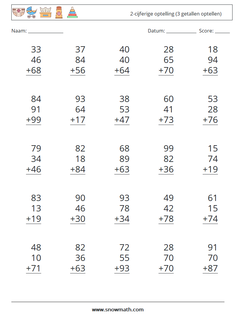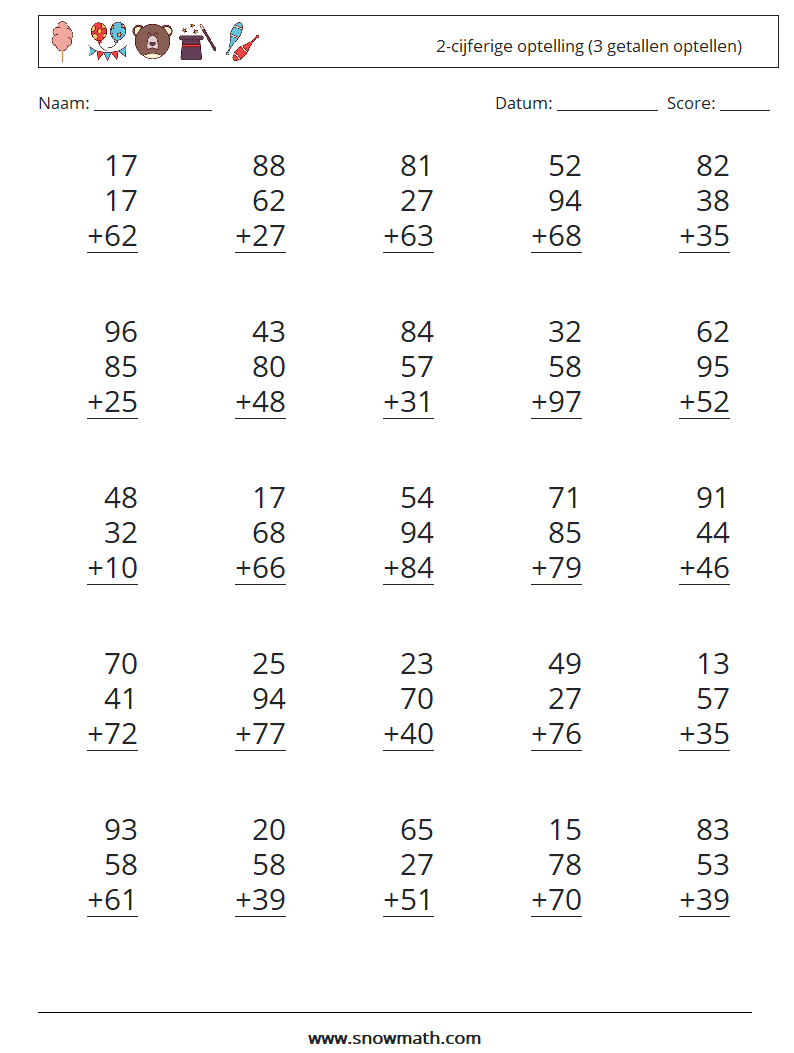 (25) 2-cijferige optelling (3 getallen optellen) Wiskundige werkbladen 5