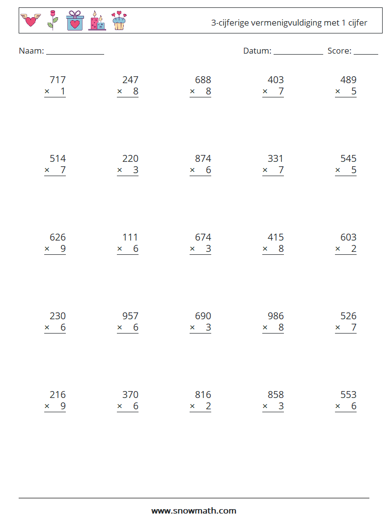 (25) 3-cijferige vermenigvuldiging met 1 cijfer Wiskundige werkbladen 3