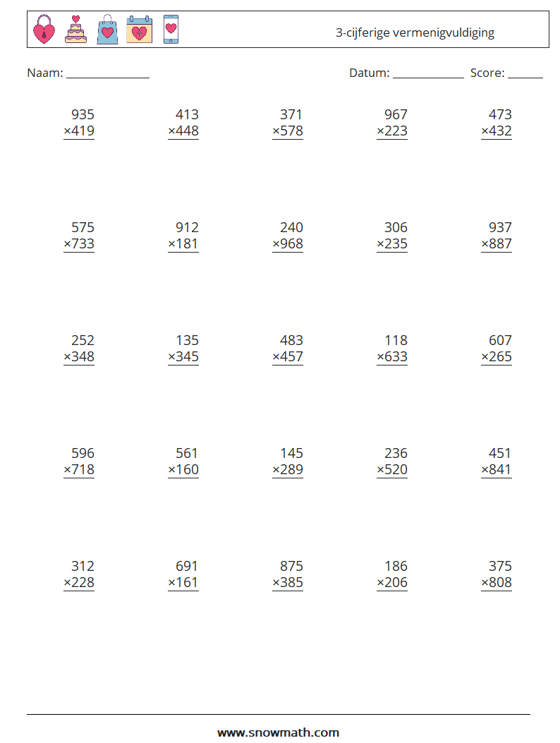 (25 wiskundevragen) Oefen werkbladen voor vermenigvuldigen met 3 cijfers.