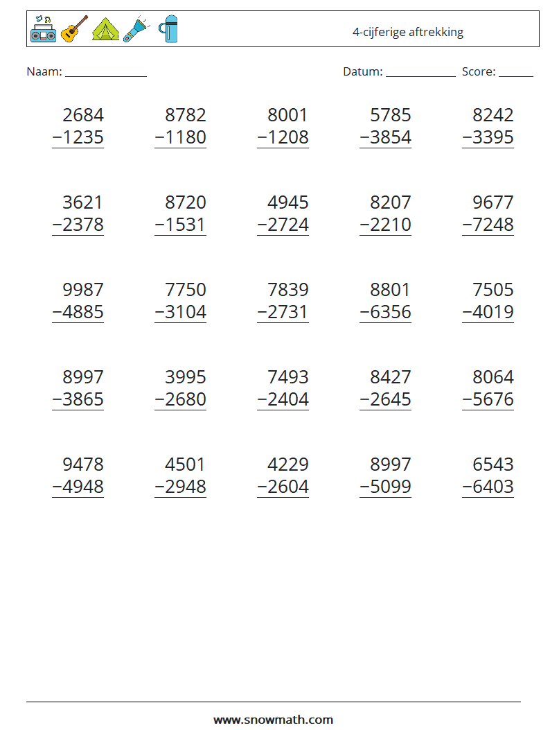 (25) 4-cijferige aftrekking Wiskundige werkbladen 5