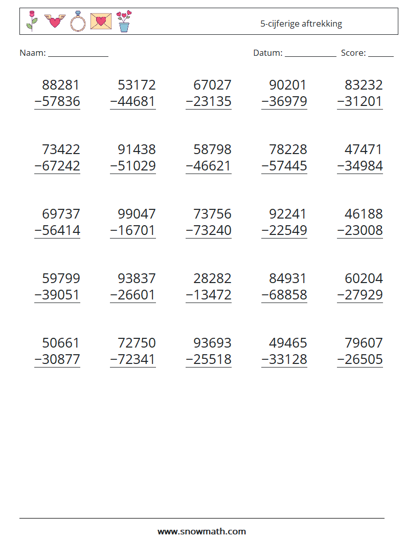 (25) 5-cijferige aftrekking Wiskundige werkbladen 10