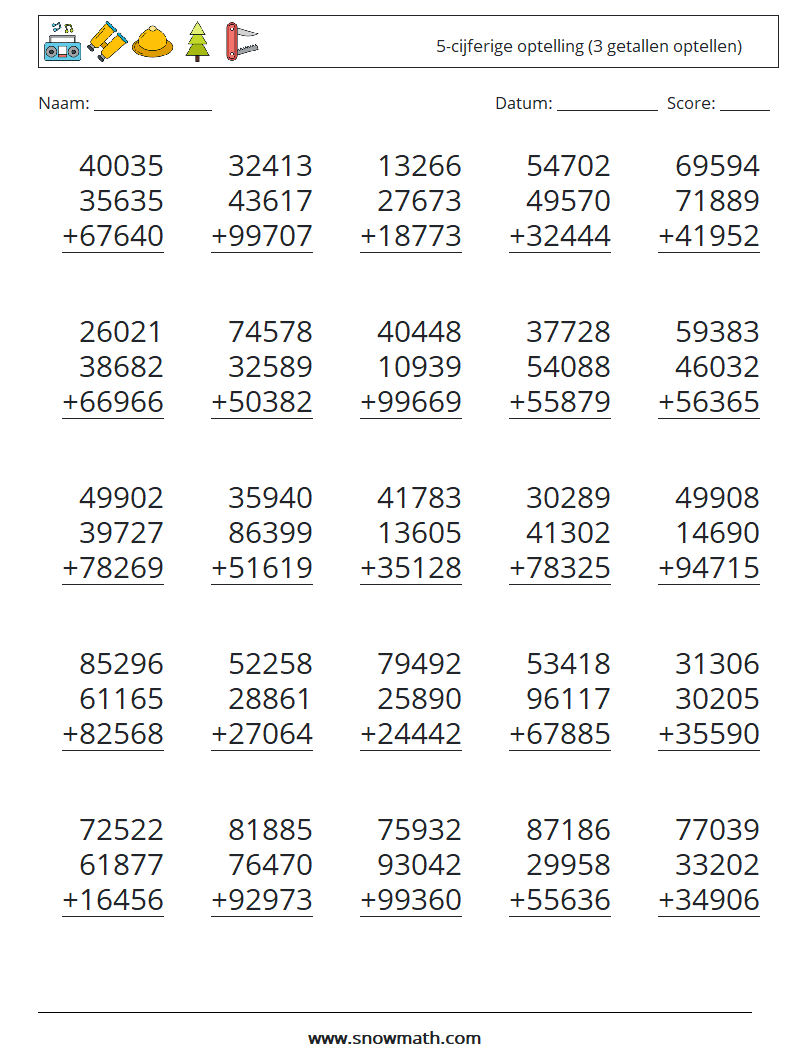 (25) 5-cijferige optelling (3 getallen optellen) Wiskundige werkbladen 5