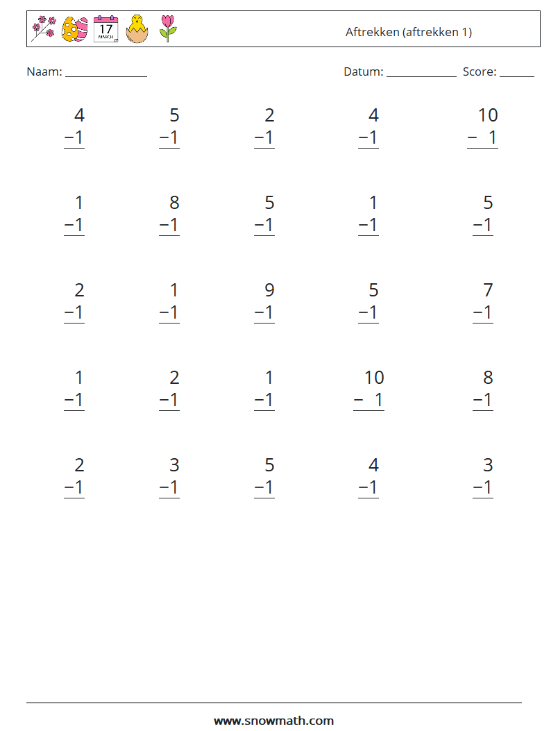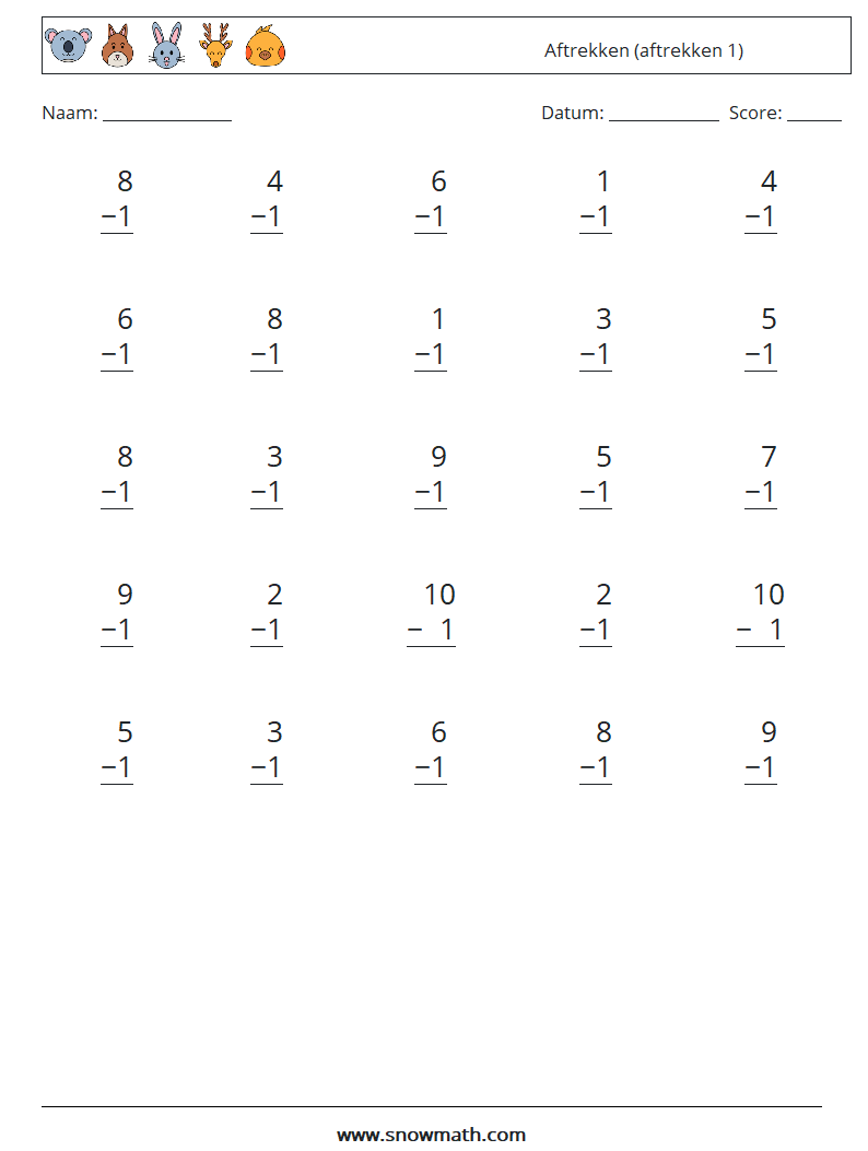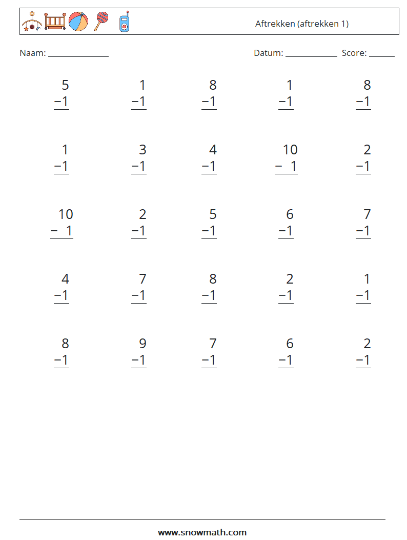 (25) Aftrekken (aftrekken 1) Wiskundige werkbladen 1