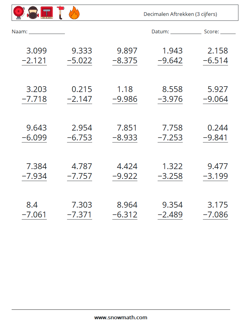 (25) Decimalen Aftrekken (3 cijfers) Wiskundige werkbladen 15
