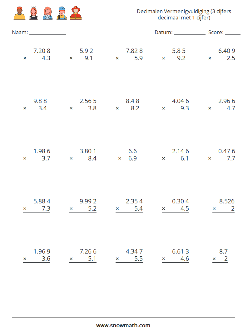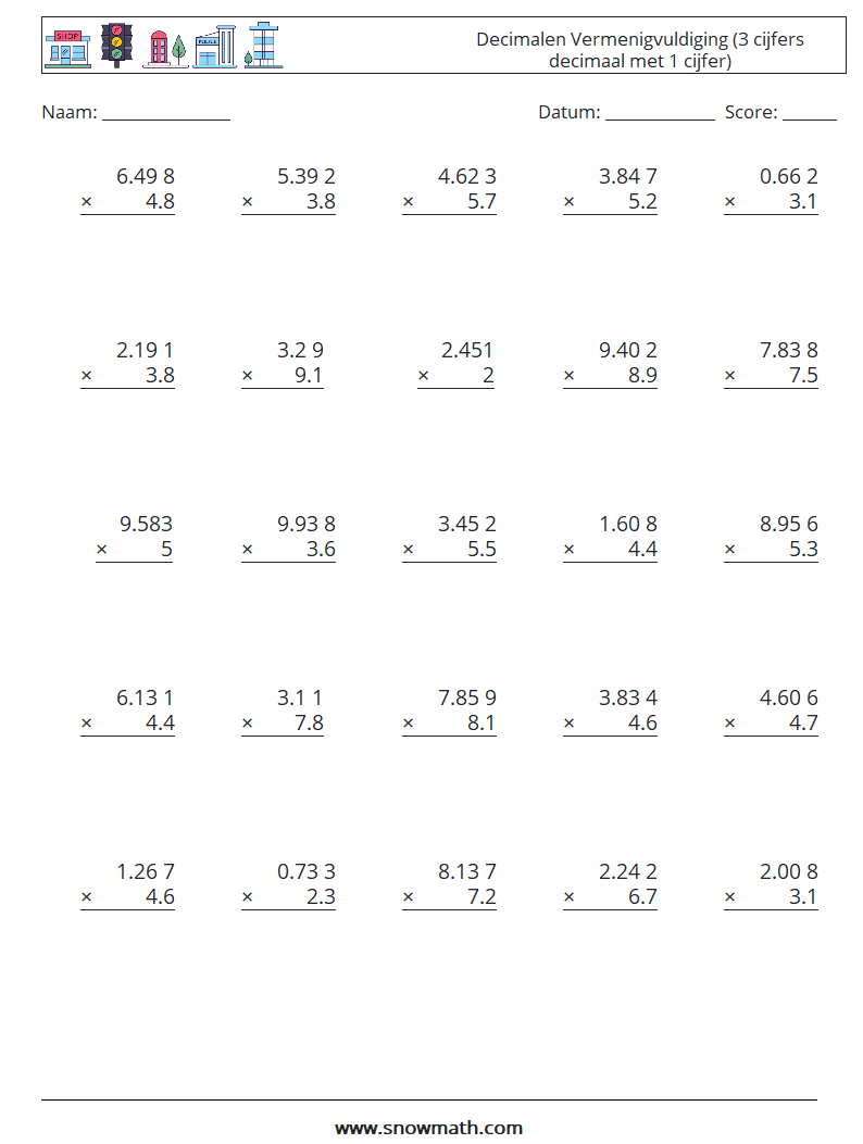 (25) Decimalen Vermenigvuldiging (3 cijfers decimaal met 1 cijfer) Wiskundige werkbladen 10