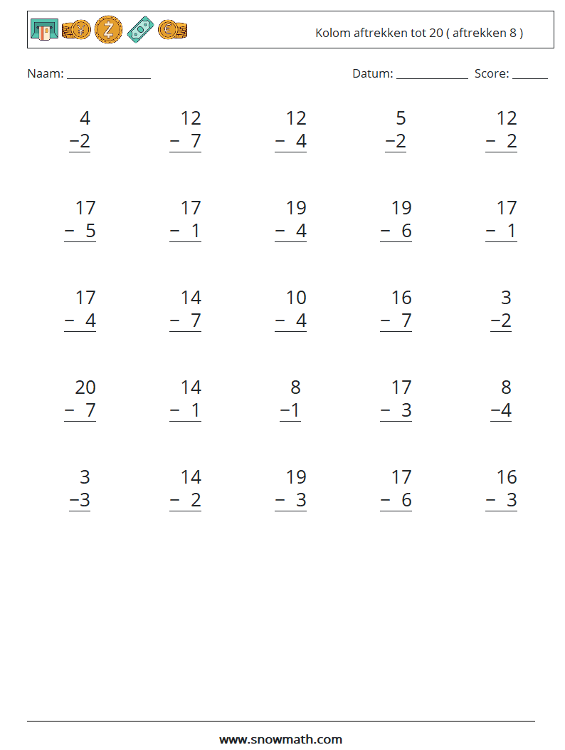 (25) Kolom aftrekken tot 20 ( aftrekken 8 ) Wiskundige werkbladen 5