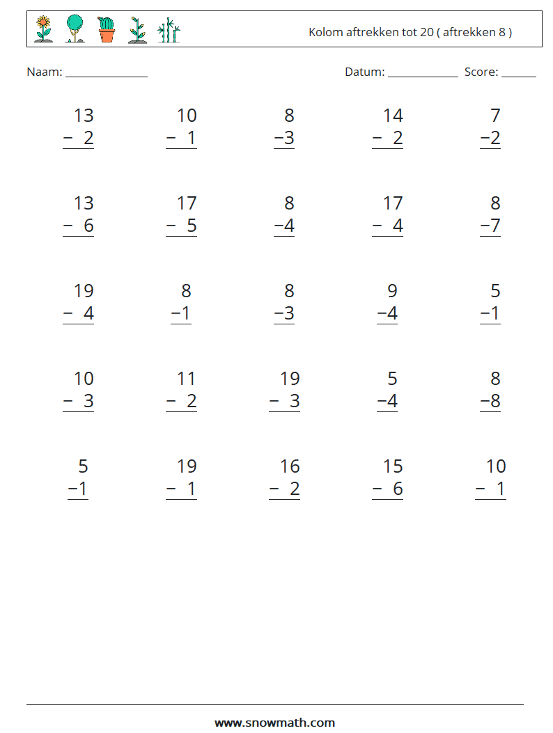 (25) Kolom aftrekken tot 20 ( aftrekken 8 ) Wiskundige werkbladen 13