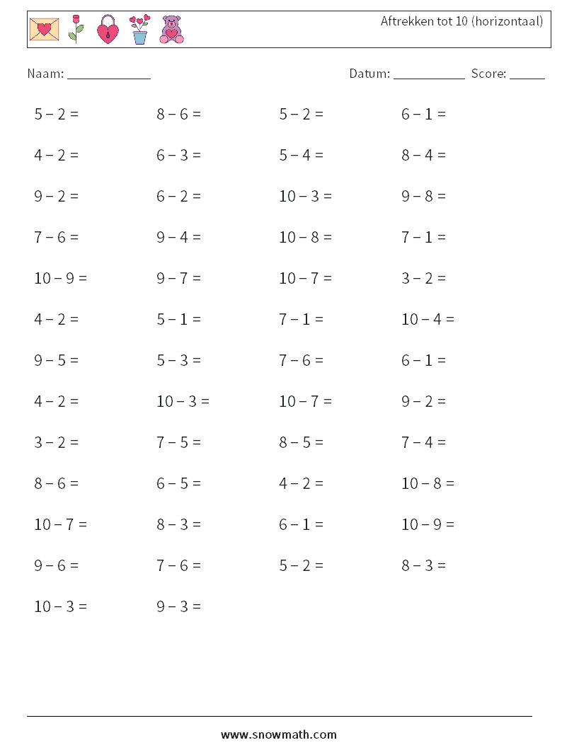 (50) Aftrekken tot 10 (horizontaal) Wiskundige werkbladen 2