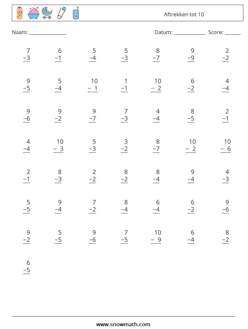 (50) Aftrekken tot 10 Wiskundige werkbladen 7