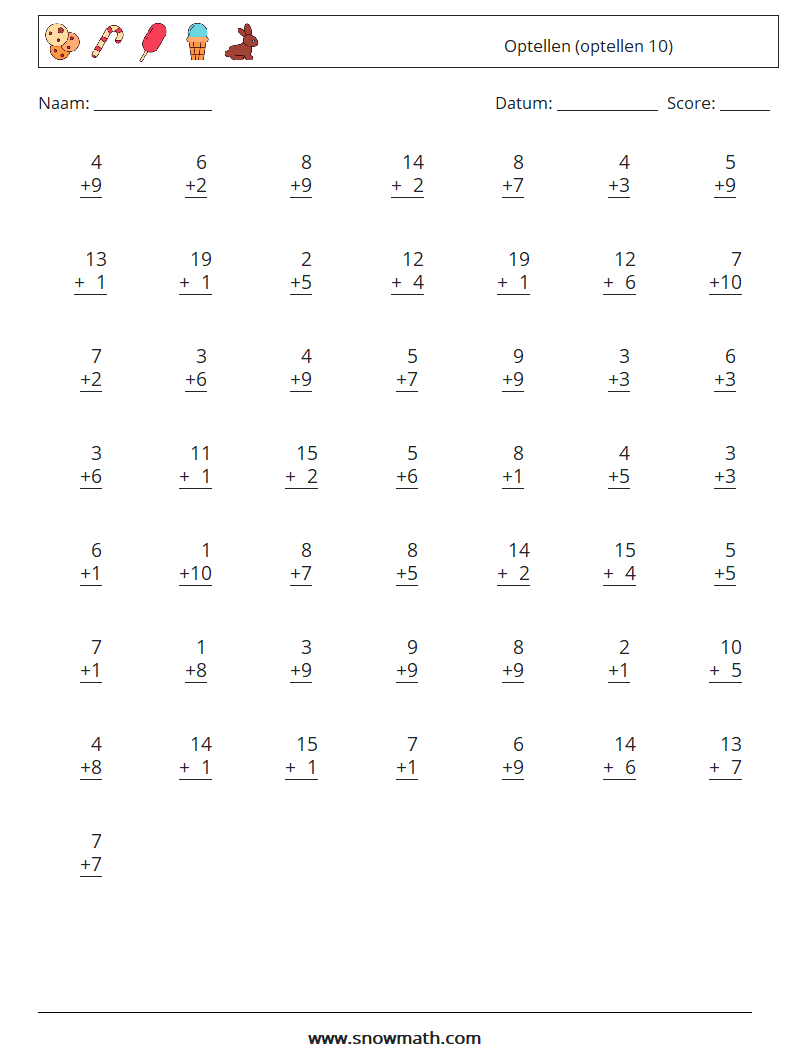 (50) Optellen (optellen 10) Wiskundige werkbladen 17