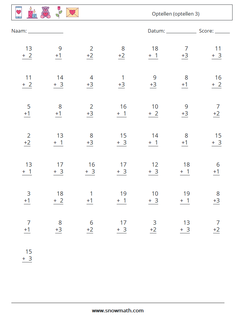 (50) Optellen (optellen 3) Wiskundige werkbladen 7