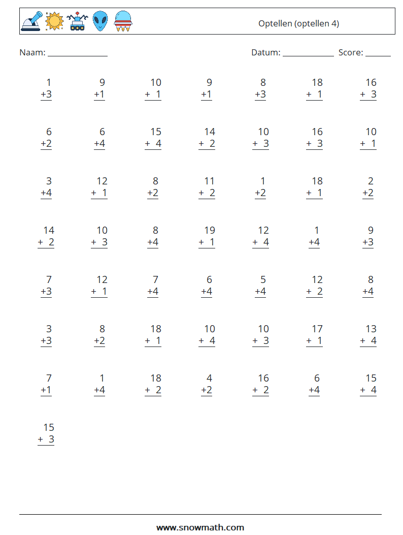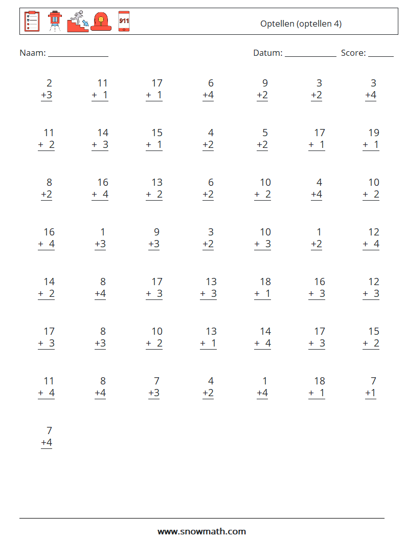 (50) Optellen (optellen 4) Wiskundige werkbladen 18