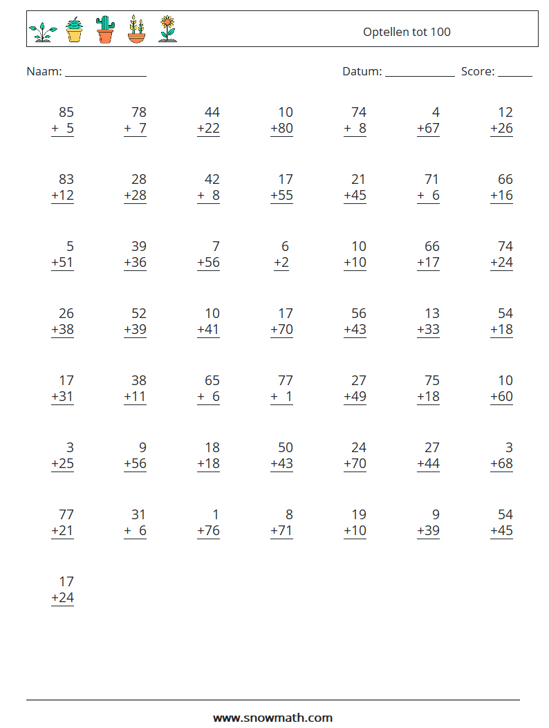(50 wiskundevragen) Leer optellen tot 100. huiswerk voor leerlingen.