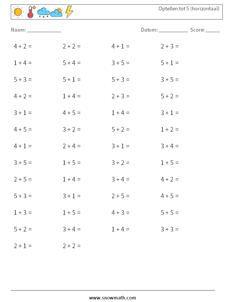 (50) Optellen tot 5 (horizontaal) Wiskundige werkbladen 2