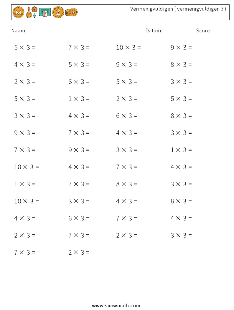 (50 wiskundevragen) Werkbladen vermenigvuldigen afdrukken (vermenigvuldigen met 3)