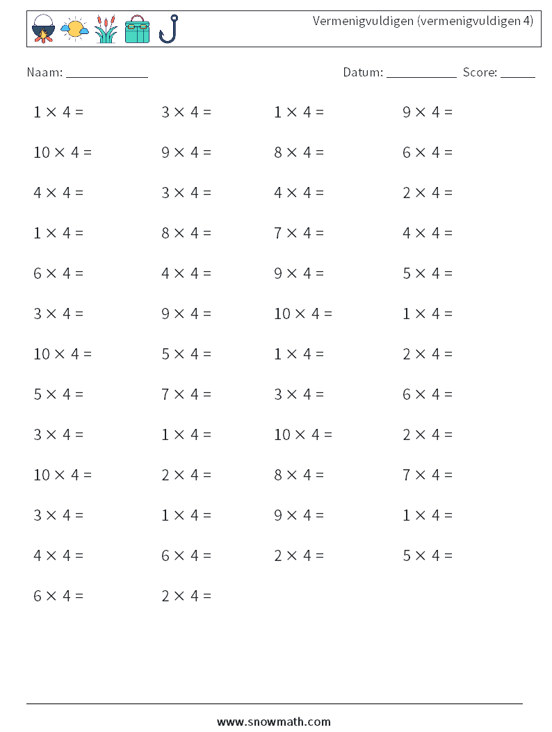 (50 wiskundevragen) Werkbladen vermenigvuldigen afdrukken (vermenigvuldigen met 4)