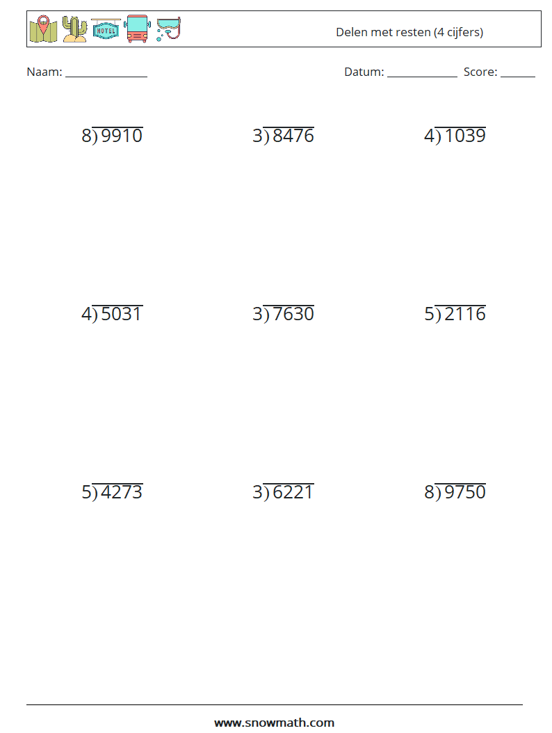 (9) Delen met resten (4 cijfers) Wiskundige werkbladen 9