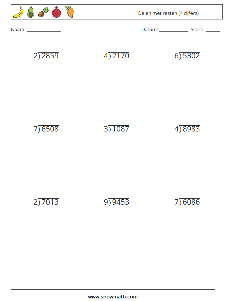 (9) Delen met resten (4 cijfers) Wiskundige werkbladen 12