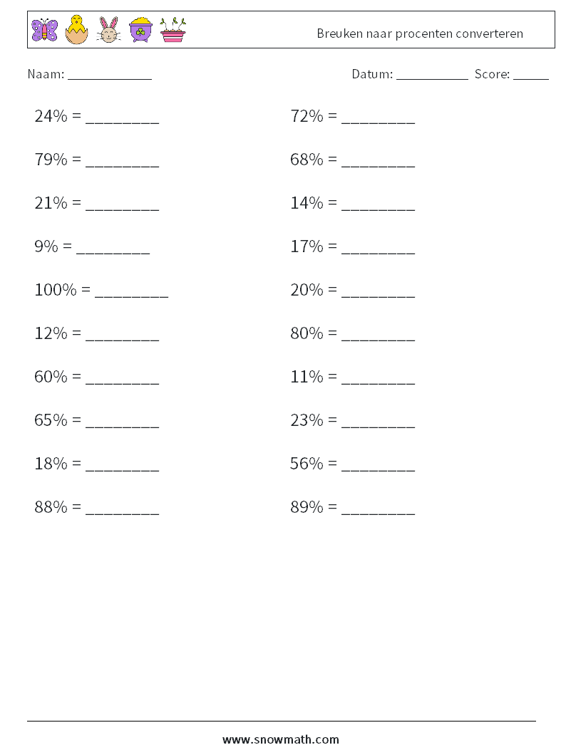 Zet breuken om in procenten, gratis wiskunde-werkbladen.