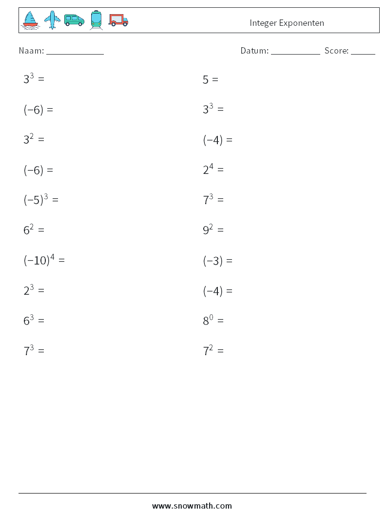Integer Exponenten, gratis wiskunde-werkbladen.