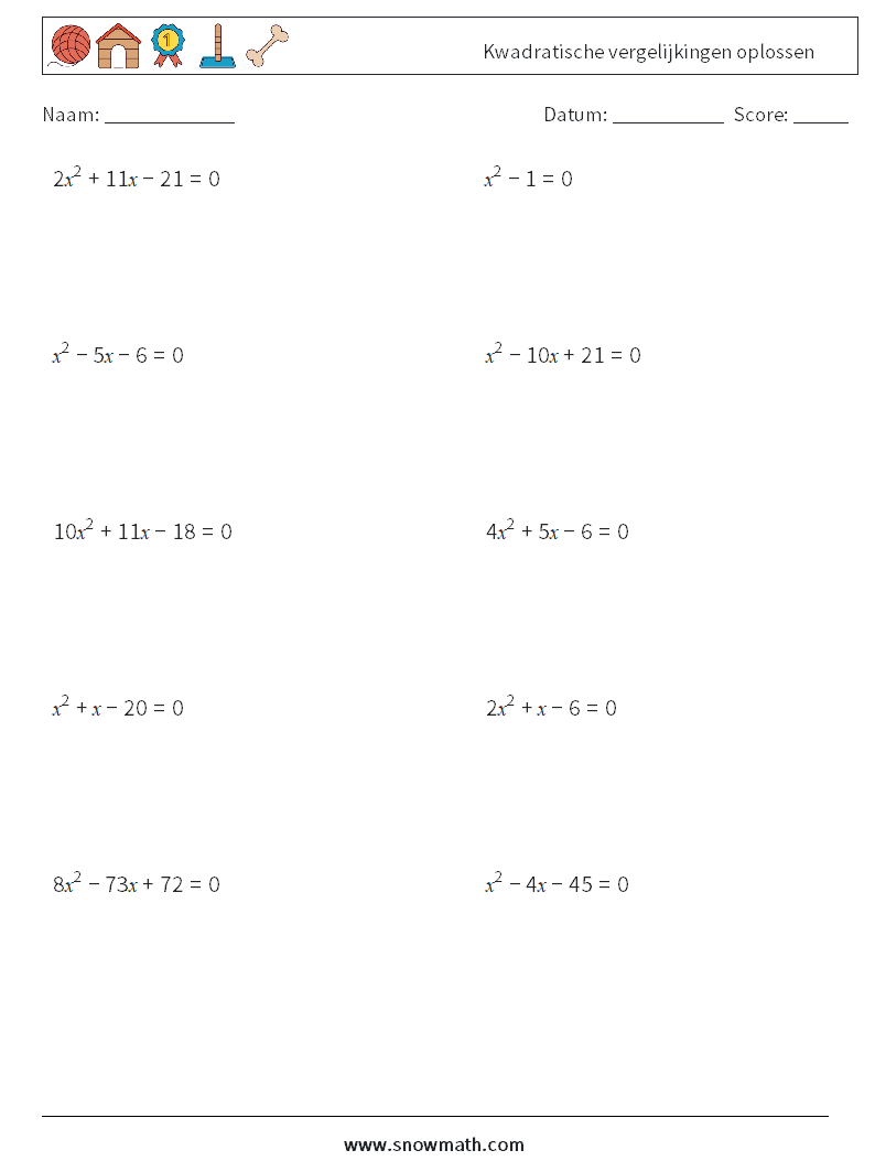Kwadratische vergelijkingen oplossen Wiskundige werkbladen 1