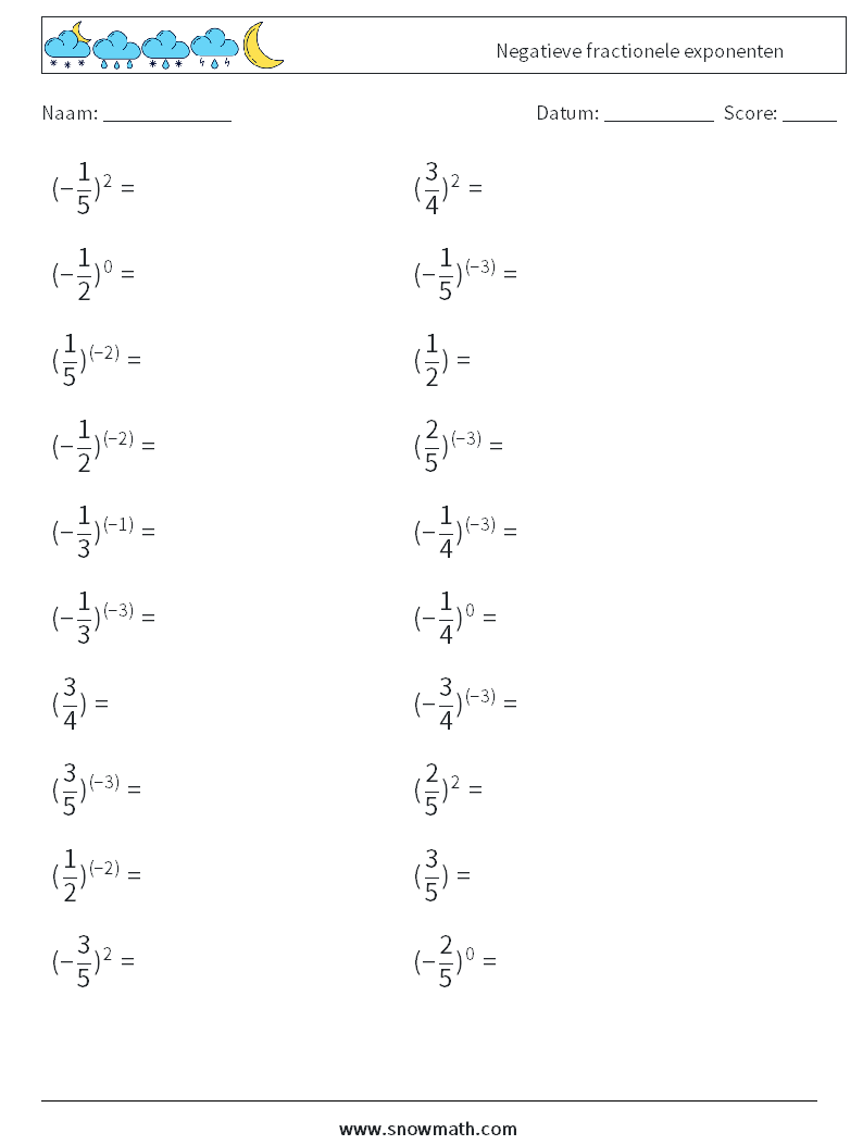 Negatieve fractionele exponenten Wiskundige werkbladen 2