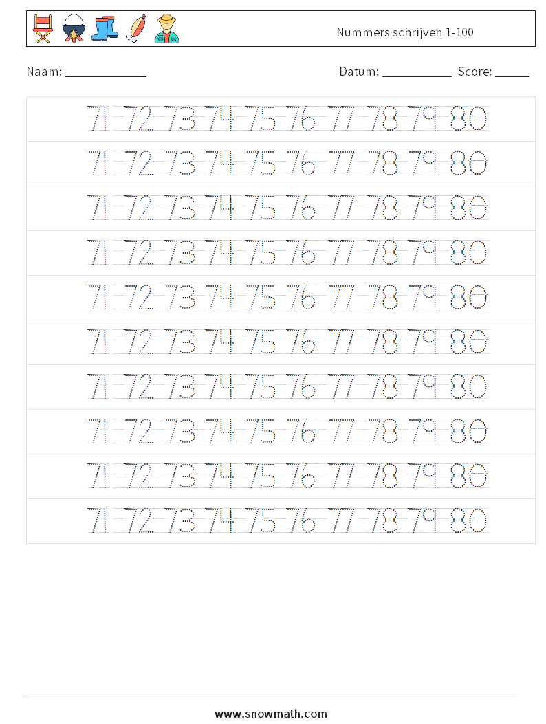 Nummers schrijven 1-100 Wiskundige werkbladen 32