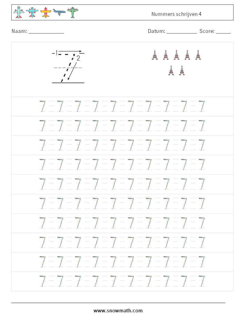 Leer hoe je nummer 7 schrijft, afdrukbare werkbladen