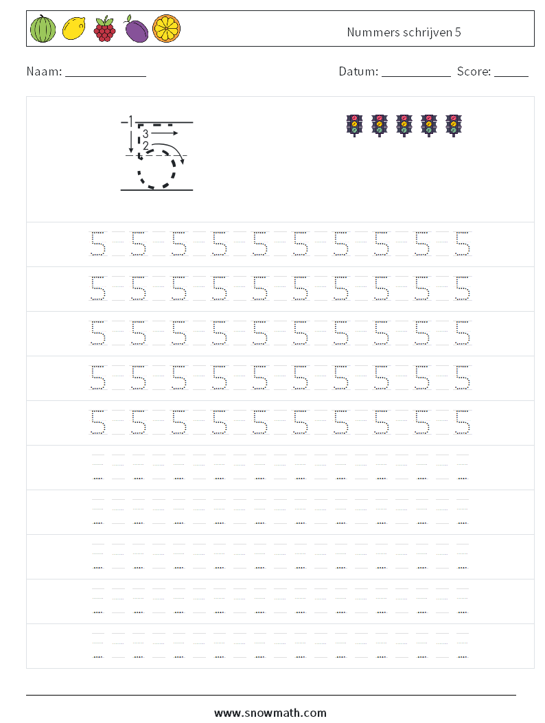 Leer getallen, schrijf nummer 5, afdrukbare pdf-werkbladen