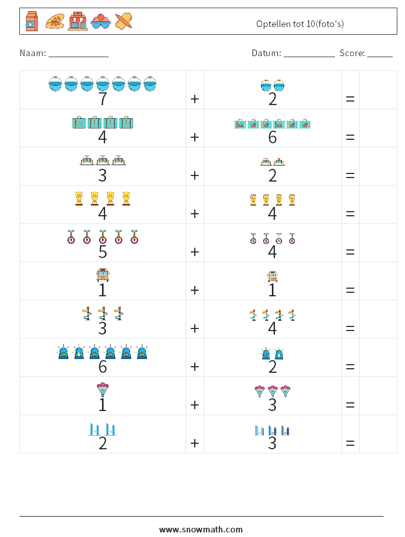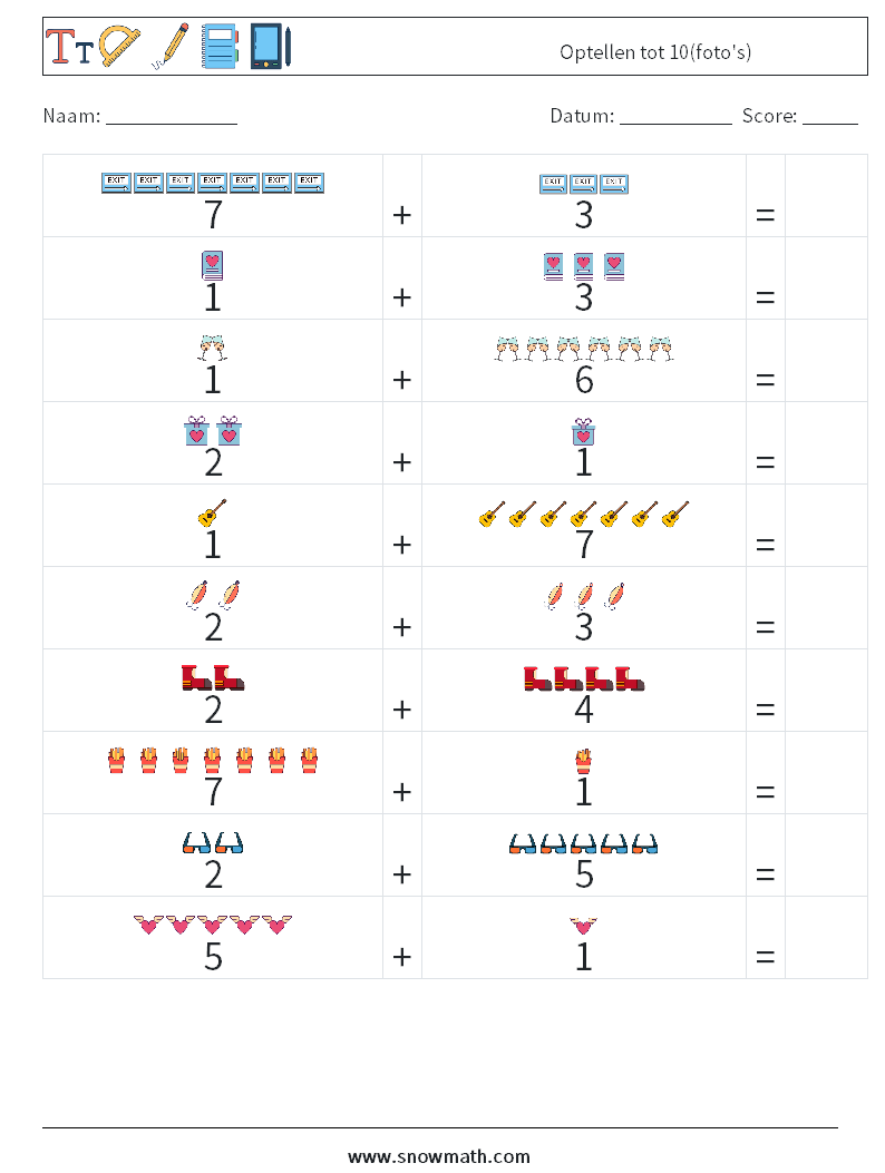Optellen tot 10(foto's) Wiskundige werkbladen 10