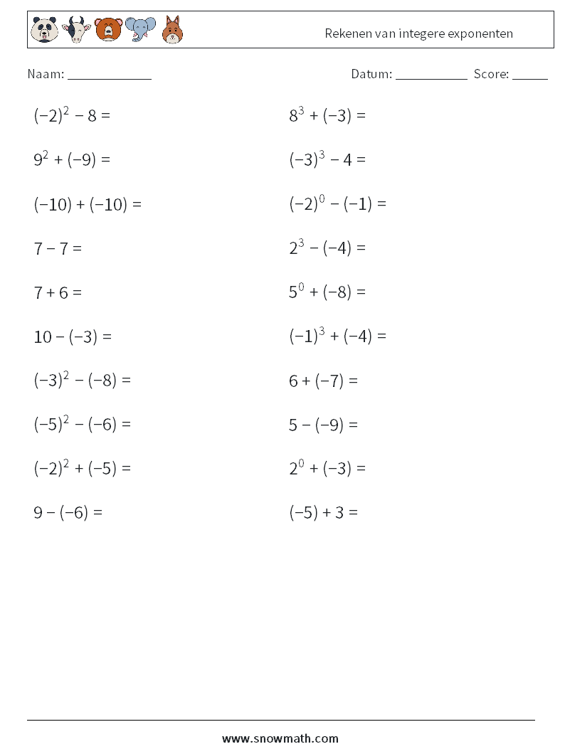 Rekenen van Integer Exponenten, optellen, aftrekken, vermenigvuldigen en delen, gratis wiskundige werkbladen.