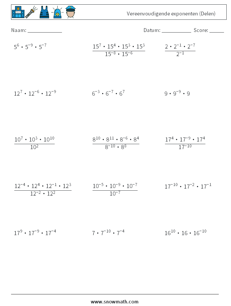 Vereenvoudiging van exponentiële uitdrukkingen (delen en vermenigvuldigen), gratis wiskundige werkbladen.
