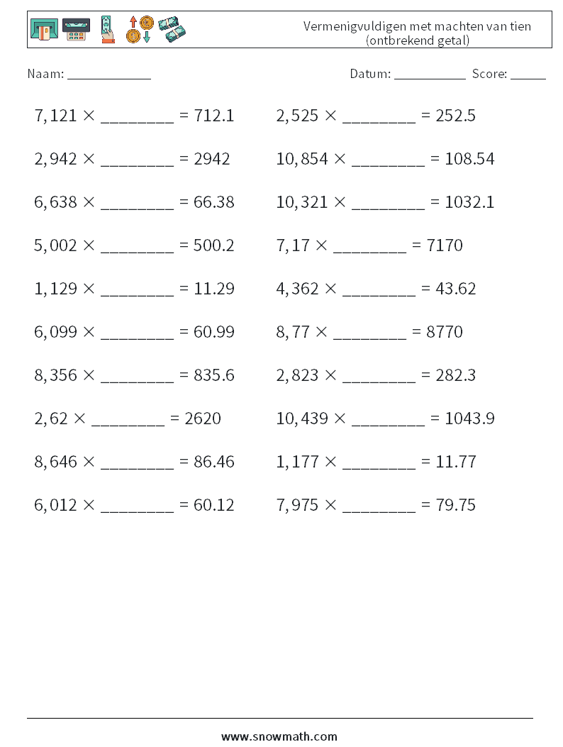 Vermenigvuldig decimalen met machten van tien, bereken ontbrekend getal, gratis rekenwerkbladen.