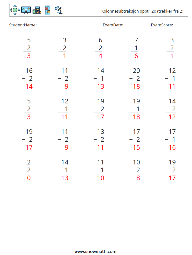 (25) Kolonnesubtraksjon opptil 20 (trekker fra 2)