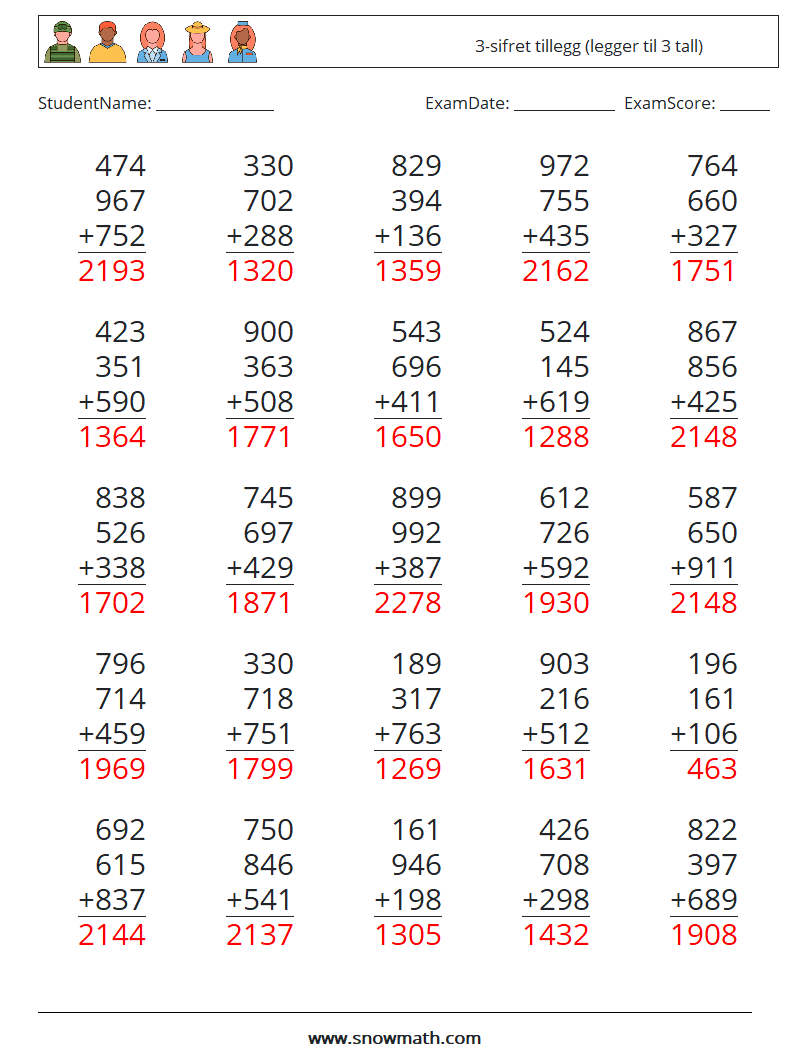 (25) 3-sifret tillegg (legger til 3 tall)