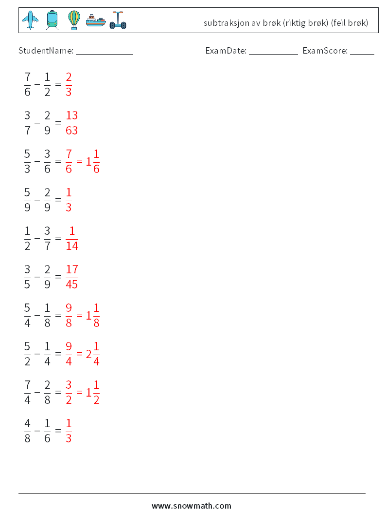 (10) subtraksjon av brøk (riktig brøk) (feil brøk)