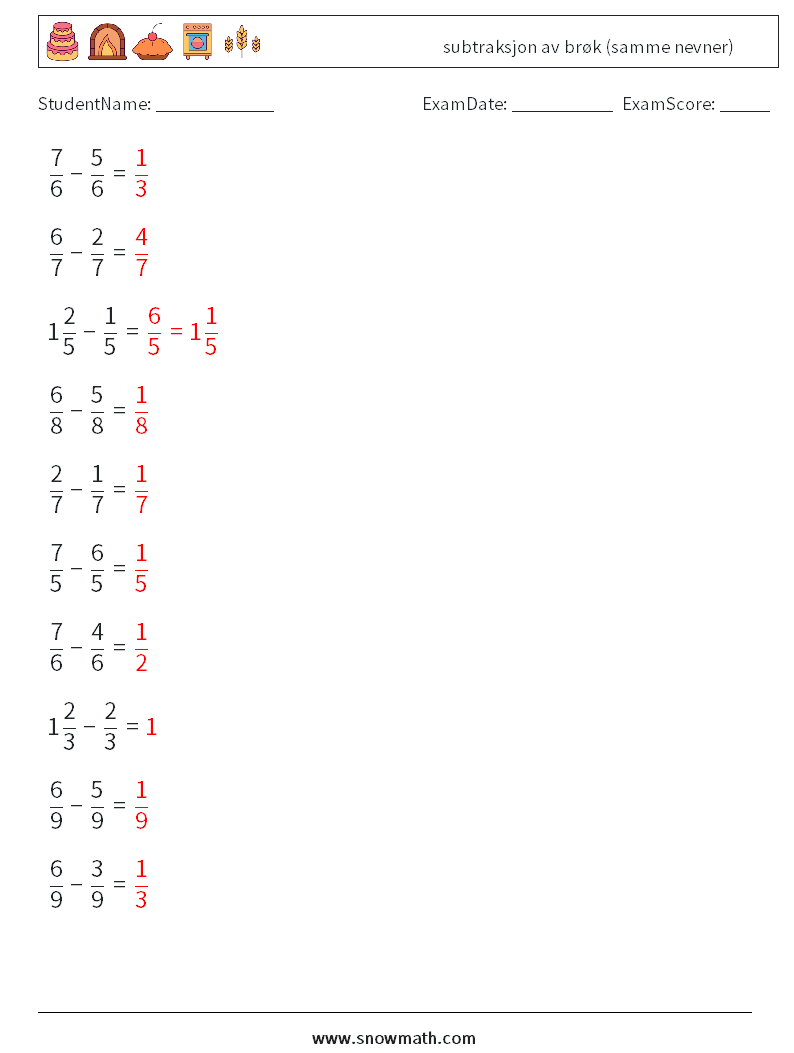 (10) subtraksjon av brøk (samme nevner)