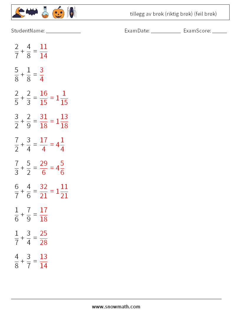 (10) tillegg av brøk (riktig brøk) (feil brøk)