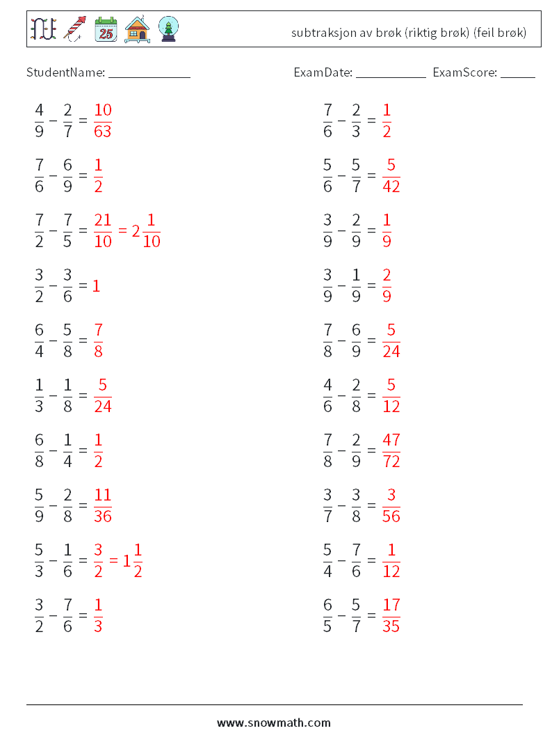 (20) subtraksjon av brøk (riktig brøk) (feil brøk)