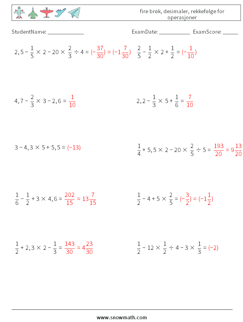 (10) fire brøk, desimaler, rekkefølge for operasjoner