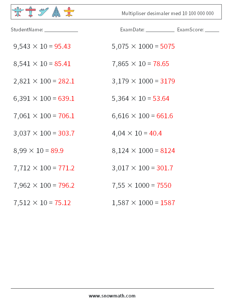 Multipliser desimaler med 10 100 000 000