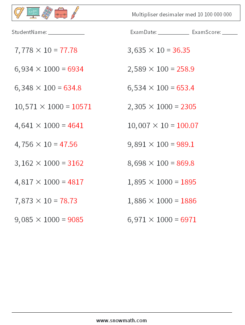 Multipliser desimaler med 10 100 000 000